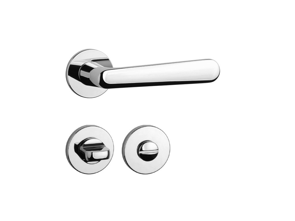Rozetová kľučka na interiérové dvere s okrúhlou rozetou je vyrobená z materiálov vysokej kvality - zamak a je povrchovo upravená. Rozeta má priemer 52 mm a hrúbku len 5 mm. Minimalistický dizajn rozety s vysokou stabilitou kľučky na dverách pôsobí jemne, a tým ponecháva priestor pre vyniknutie dizajnu samotnej kľučky.