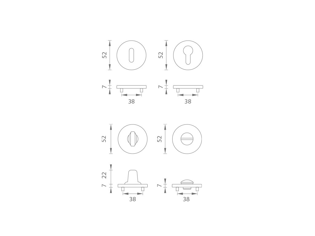 Rozeta má oválny otvor pre interiérový kľúč (BB), otvor pre cylindrickú vložku (PZ), WC set s vmontovaným kľúčom.