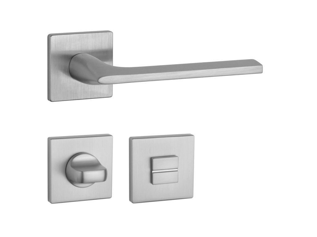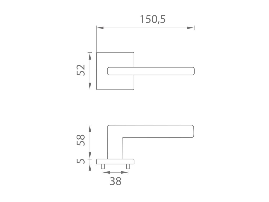 Rozetová kľučka na interiérové dvere s hranatou rozetou je vyrobená z materiálov vysokej kvality - zamak a je povrchovo upravená. Rozeta má rozmer 52x52 mm a hrúbku len 5 mm. Minimalistický dizajn rozety s vysokou stabilitou kľučky na dverách pôsobí jemne, a tým ponecháva priestor pre vyniknutie dizajnu samotnej kľučky.
