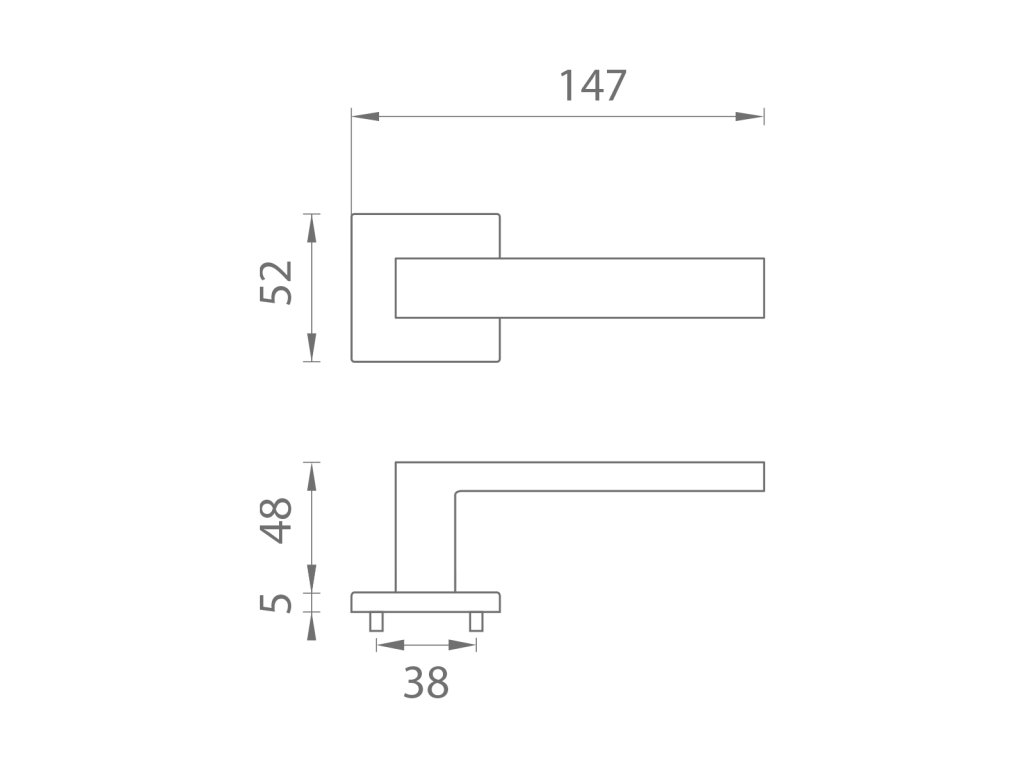 Rozetová kľučka na interiérové dvere s hranatou rozetou je vyrobená z materiálov vysokej kvality - zamak a je povrchovo upravená. Rozeta má rozmer 52x52 mm a hrúbku len 5 mm. Minimalistický dizajn rozety s vysokou stabilitou kľučky na dverách pôsobí jemne, a tým ponecháva priestor pre vyniknutie dizajnu samotnej kľučky.