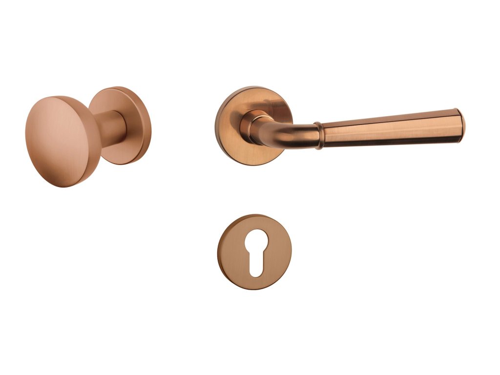 Mechanizmus kľučky obsahuje vratnú pružinu. Výstupky na rozete zabraňujú jej pretáčaniu a skrutky na preskrutkovanie cez celú šírku dverí zaručia pevnejšie a stabilnejšie uchytenie kovania.