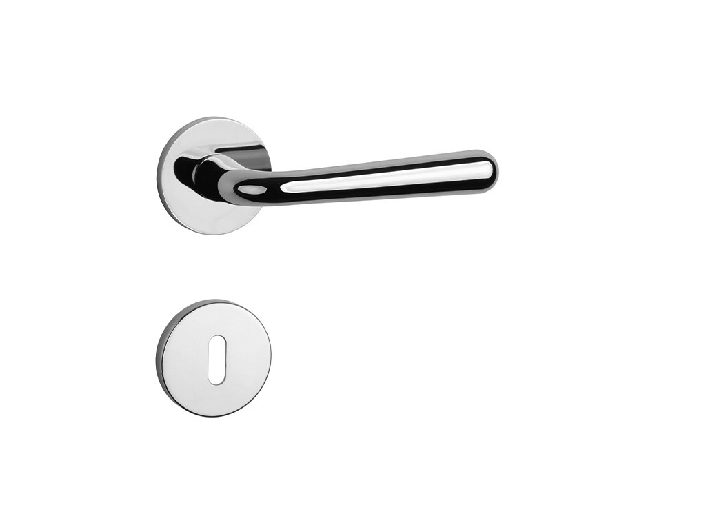 Rozetová kľučka na interiérové dvere s okrúhlou rozetou je vyrobená z materiálov vysokej kvality - zamak a je povrchovo upravená. Rozeta má priemer 52 mm a hrúbku len 7 mm. Minimalistický dizajn rozety s vysokou stabilitou kľučky na dverách pôsobí jemne, a tým ponecháva priestor pre vyniknutie dizajnu samotnej kľučky.Vlastnosti kľučky pre APRILE LINE: