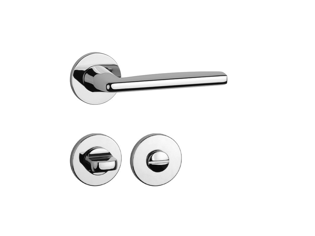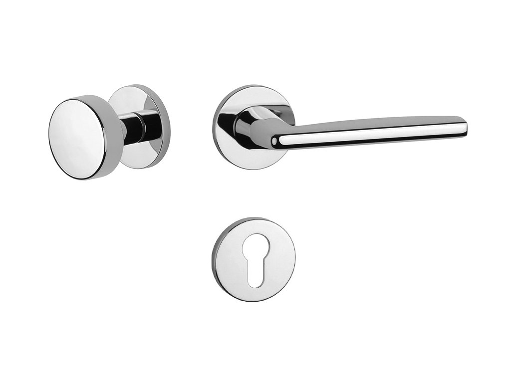 Rozetová kľučka na interiérové dvere s okrúhlou rozetou je vyrobená z materiálov vysokej kvality - zamak a je povrchovo upravená. Rozeta má priemer 53 mm a hrúbku len 7 mm. Minimalistický dizajn rozety s vysokou stabilitou kľučky na dverách pôsobí jemne, a tým ponecháva priestor pre vyniknutie dizajnu samotnej kľučky.