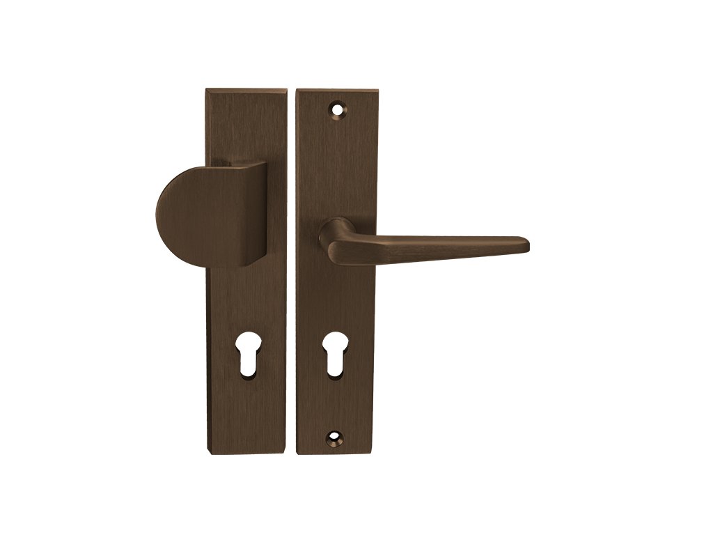 Štítová kľučka na vchodové a bezpečnostné dvere s bezpečnostným hranatým štítom bez prekrytia cylindrickej vložky je vyrobená z hliníka a je povrchovo upravená. Hranatý štít má rozmery 52 mm x 242 mm a hrúbku 15 mm.