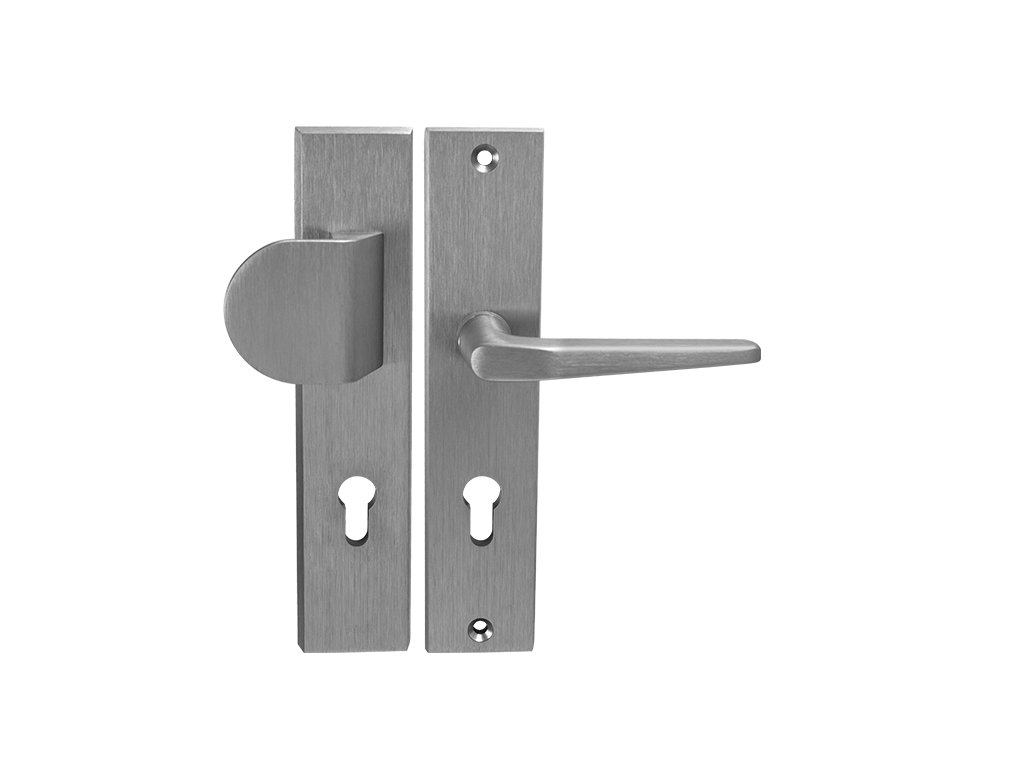 Štítová kľučka na vchodové a bezpečnostné dvere s bezpečnostným hranatým štítom bez prekrytia cylindrickej vložky je vyrobená z hliníka a je povrchovo upravená. Hranatý štít má rozmery 52 mm x 242 mm a hrúbku 15 mm.