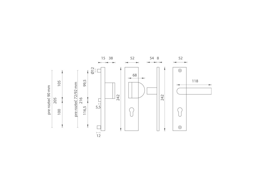 Pri bezpečnostnom kovaní je potrebné poznať vzdialenosť medzi osou kľučky a osou kľúča (rozteč). Štandardná vzdialenosť je 72, 90 alebo 92 mm. Kovanie s roztečou 72 a 90 mm je štandardom pre hrúbku dverí od 38 mm do 50 mm. Kovanie s roztečou 92 mm je štandardom pre hrúbku dverí od 68 mm do 78mm.