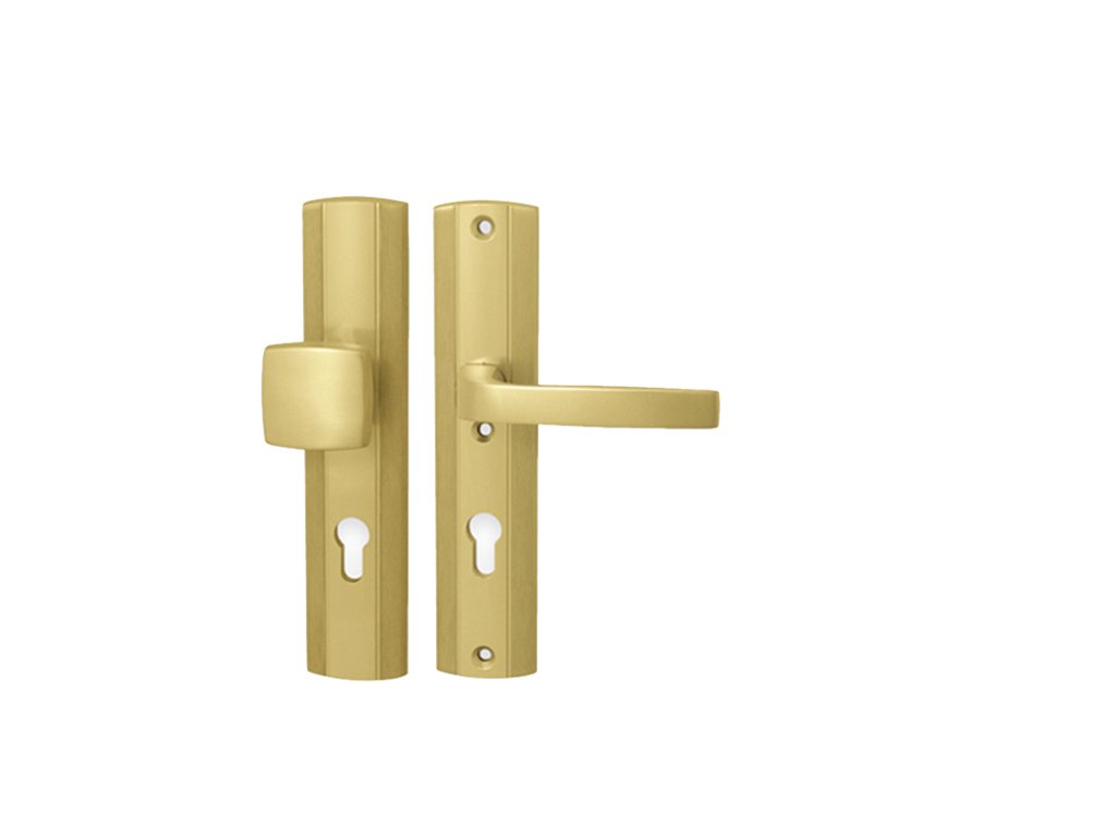 Štítová kľučka na vchodové a bezpečnostné dvere s bezpečnostným hranatým štítom bez prekrytia cylindrickej vložky je vyrobená z hliníka a je povrchovo upravená. Hranatý štít má rozmery 52 mm x 242 mm a hrúbku 15 mm.