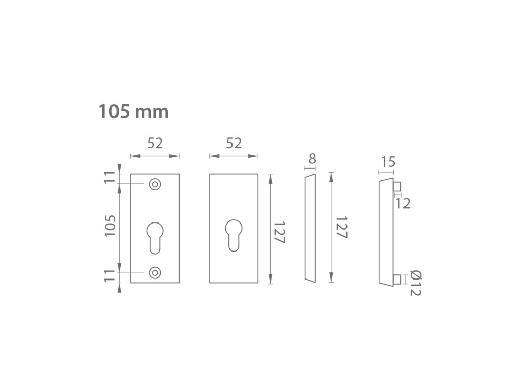 Prídavná rozeta s PZ otvorom pre vložku so vzdialenosťou otvorov pre skrutky 105 mm má celkovú dĺžku 127 mm a hrúbku 15 mm.