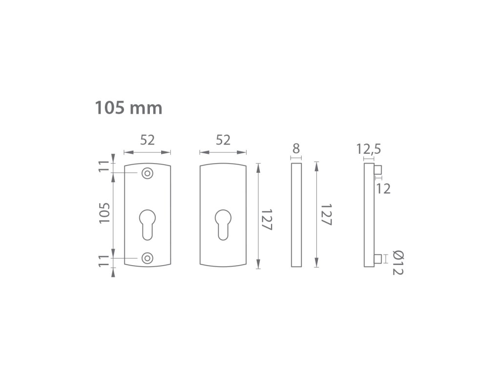 Prídavná rozeta s PZ otvorom pre vložku so vzdialenosťou otvorov pre skrutky 105 mm má celkovú dĺžku 127 mm a hrúbku 15 mm.