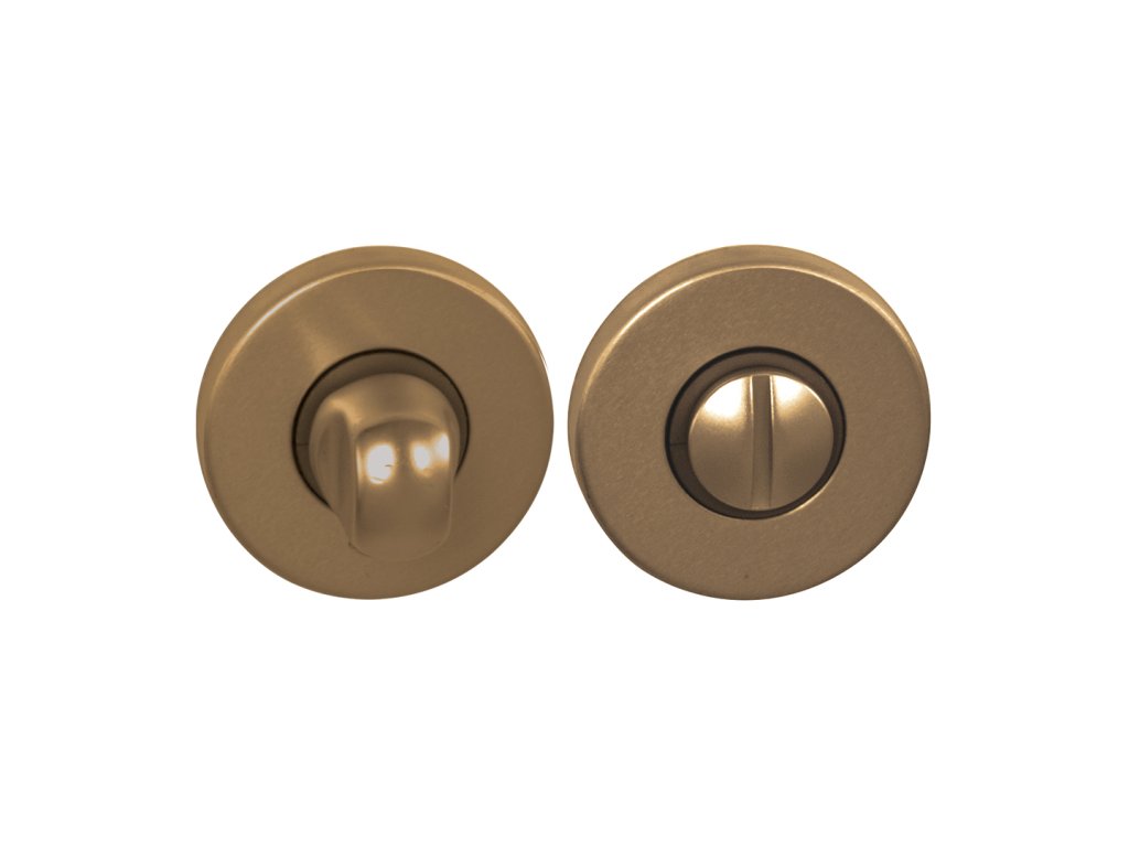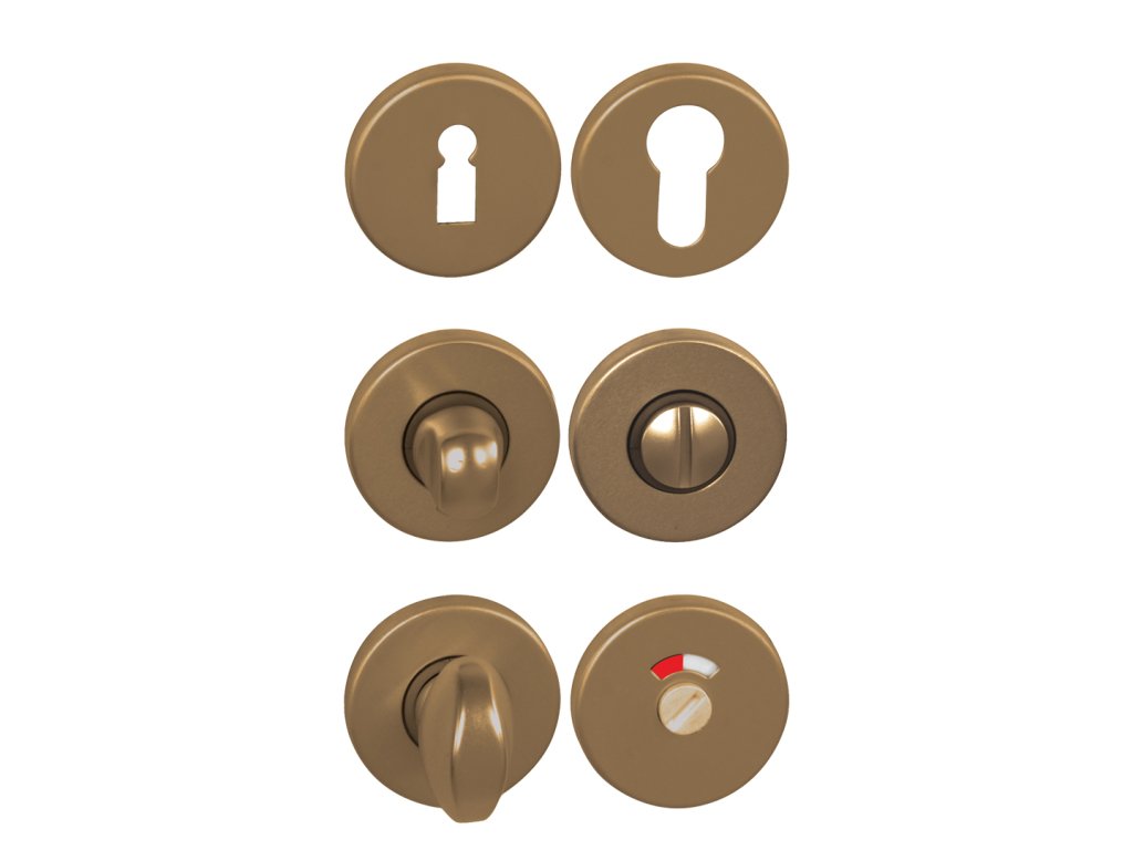Okrúhla rozeta je vyrobená z hliníka a je povrchovo upravená. Rozeta má priemer 50 mm, hrúbku 7 mm a oválny otvor pre interiérový kľúč (BB), otvor pre cylindrickú vložku (PZ) , WC set s vmontovaným kľúčom a ukazovateľom. Balenie obsahuje 2 kusy roziet (pár) a rozety WC sú v balení ako set.