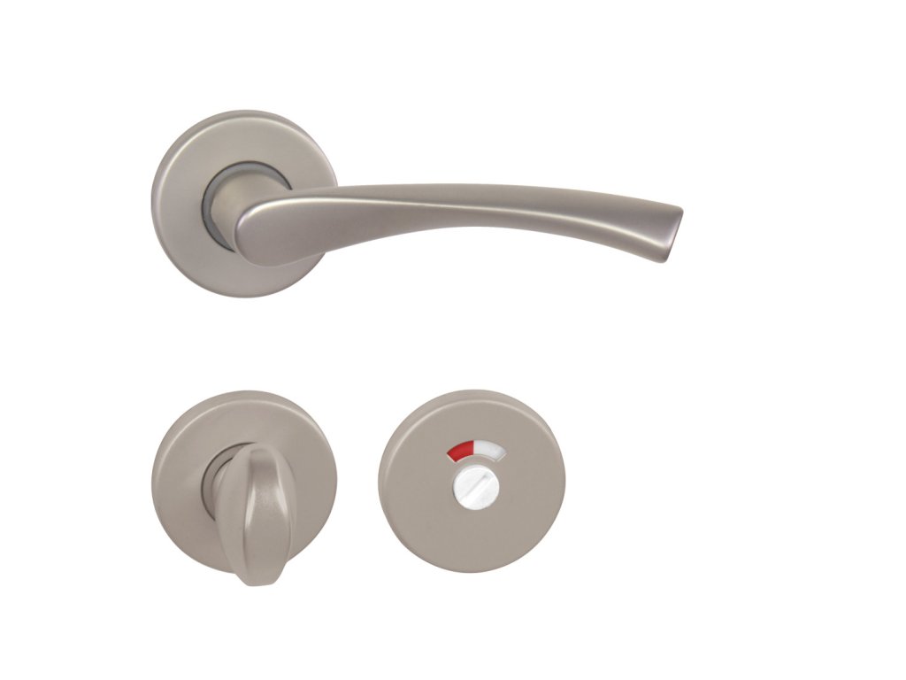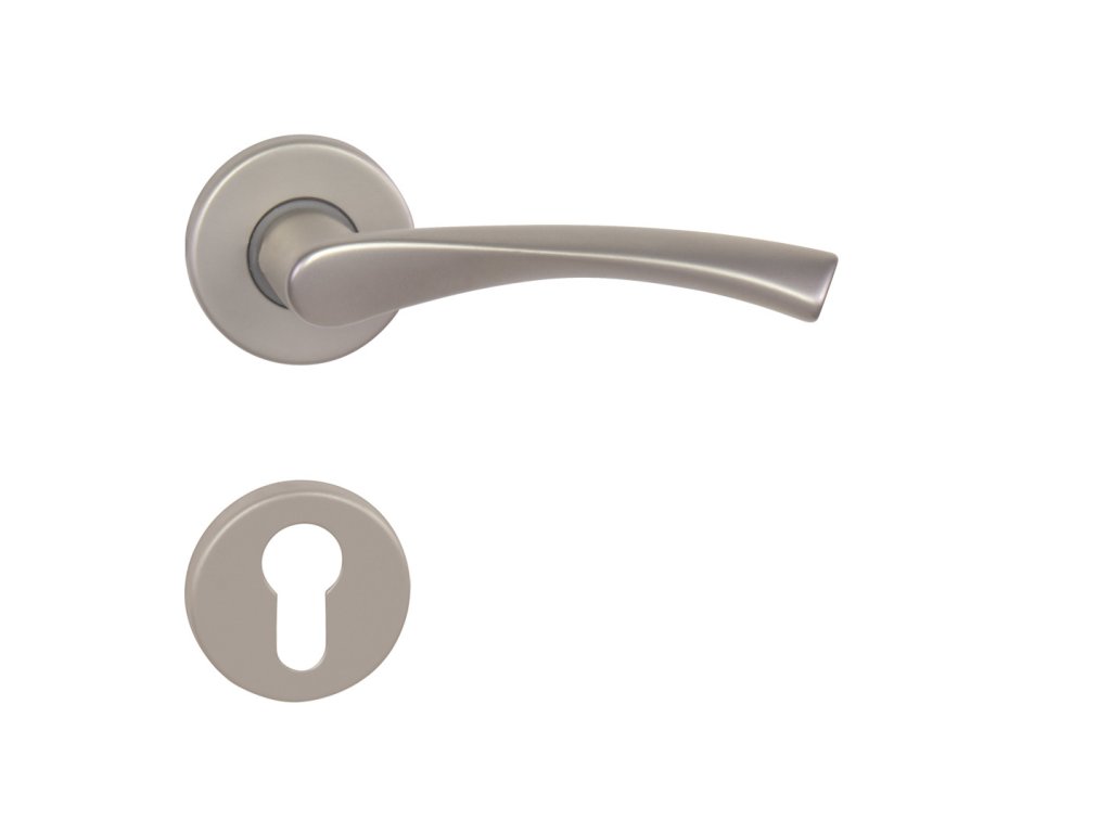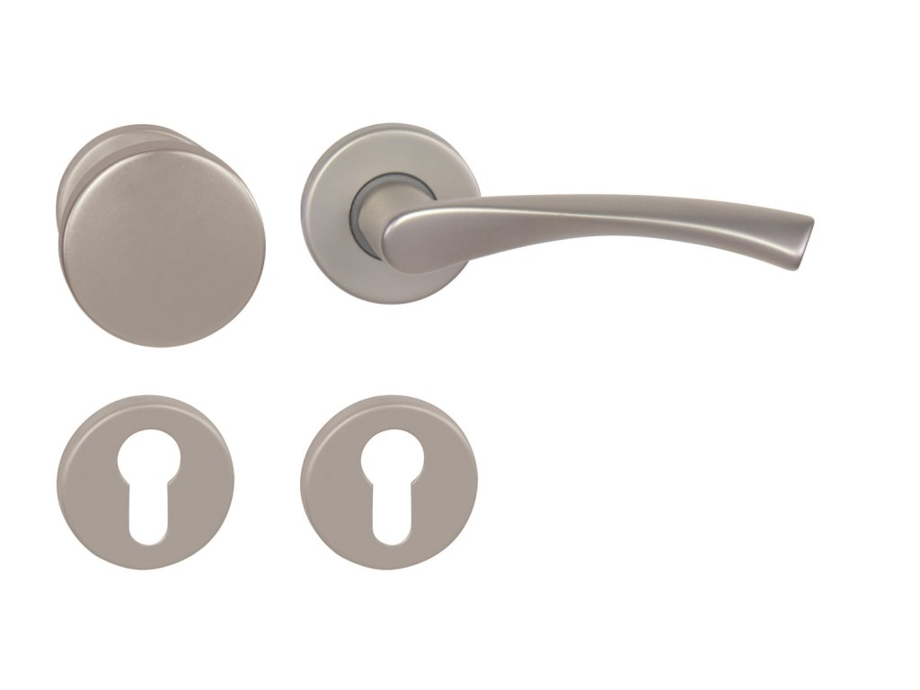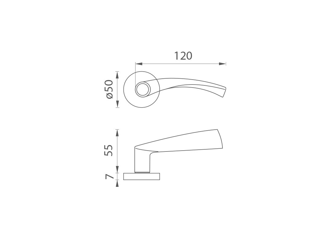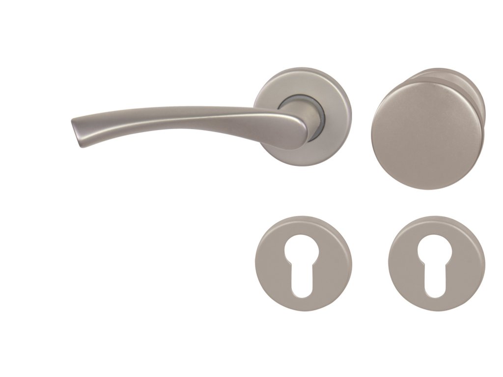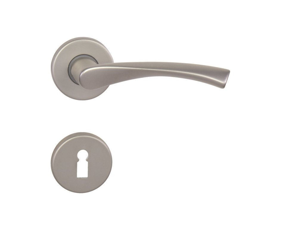 Rozetová kľučka na interiérové dvere s okrúhlou rozetou je vyrobená z hliníka a je povrchovo upravená. Rozeta má priemer 50 mm a hrúbku 7 mm. Kľučka neobsahuje vratný mechanizmus kľučky – pružinu.