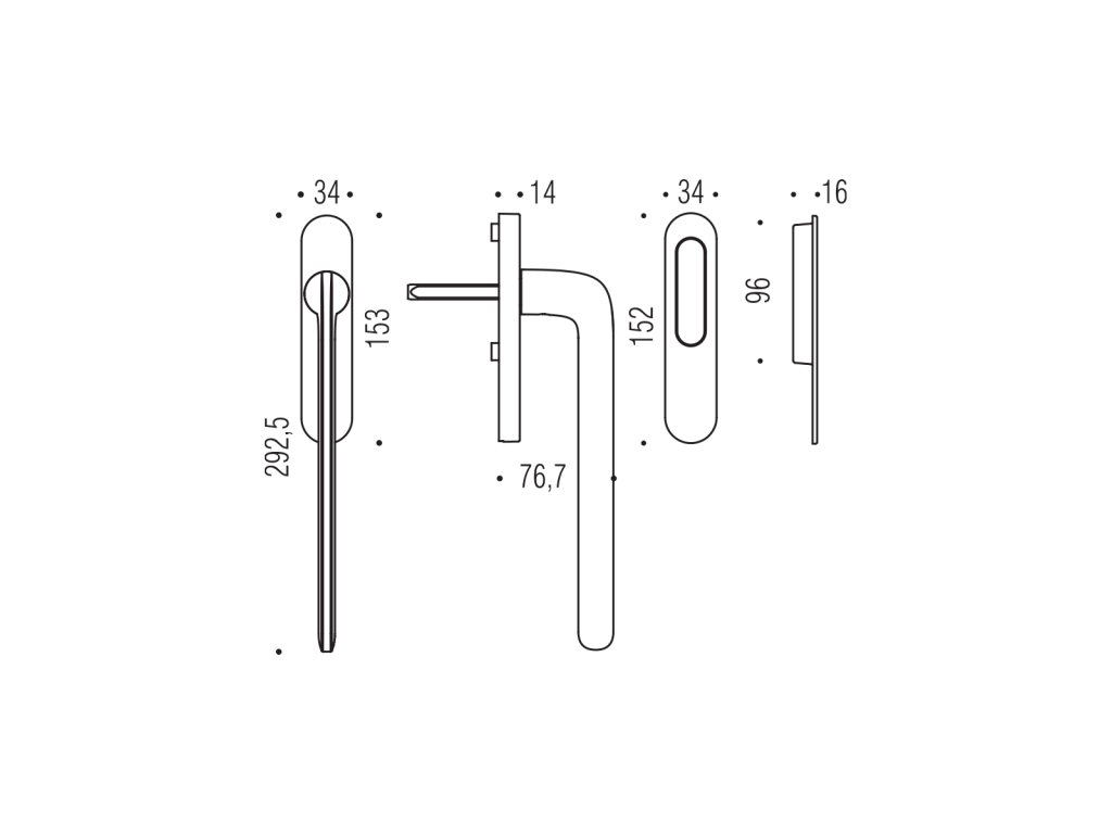 Kľučka má dĺžku 292,5 mm a oválna rozeta má rozmery 34 mm x 153 mm a hrúbku 14 mm. Mušľa má rozmery 34 mm x 152 mm a celkový zádlab 16 mm.