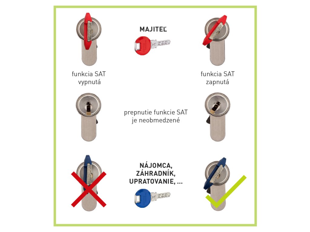servisným kľúčom zvnútra, kľúč majiteľa môže odomknúť dvere zvonku aj v polohe 8 hodín. Majiteľ má vždy prístup, aj keď