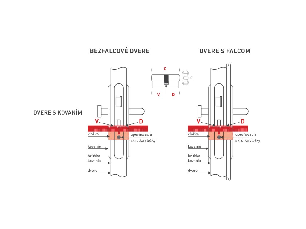 Pre určenie presného rozmeru cylindrickej vložky musí byť okrem hrúbky dverí zohľadnené aj použité kovanie alebo rozeta (je potrebné pripočítať ku hrúbke dverí). Pri dverách s falcom je tiež nutné zohľadniť posunutú osovú polohu stredu zadlabávacieho zámku. Rozmer cylindrickej vložky stanovíme po inštalácii zadlabávacieho zámku a to tak, že od stredu upevňovacej skrutky vložky v čele zadlabávacieho zámku nameriame najskôr rozmer V - von (naľavo od stredu upevňovacej skrutky vložky v čele zadlabávacieho zámku) a potom rozmer D - dnu (napravo od stredu upevňovacej skrutky vložky v čele zadlabávacieho zámku). V prípade, že ešte nemáte kovanie namontované na dverách, zmerajte rozmer iba po hranu dverí (V aj D). Následne vám pri kúpe kovania dĺžku vložky dorátajú naši pracovníci alebo obchodní partneri podľa druhu zakúpeného kovania.