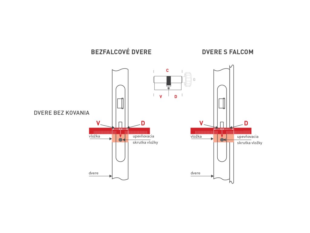 Pre určenie presného rozmeru cylindrickej vložky musí byť okrem hrúbky dverí zohľadnené aj použité kovanie alebo rozeta (je potrebné pripočítať ku hrúbke dverí). Pri dverách s falcom je tiež nutné zohľadniť posunutú osovú polohu stredu zadlabávacieho zámku. Rozmer cylindrickej vložky stanovíme po inštalácii zadlabávacieho zámku a to tak, že od stredu upevňovacej skrutky vložky v čele zadlabávacieho zámku nameriame najskôr rozmer V - von (naľavo od stredu upevňovacej skrutky vložky v čele zadlabávacieho zámku) a potom rozmer D - dnu (napravo od stredu upevňovacej skrutky vložky v čele zadlabávacieho zámku). V prípade, že ešte nemáte kovanie namontované na dverách, zmerajte rozmer iba po hranu dverí (V aj D). Následne vám pri kúpe kovania dĺžku vložky dorátajú naši pracovníci alebo obchodní partneri podľa druhu zakúpeného kovania.