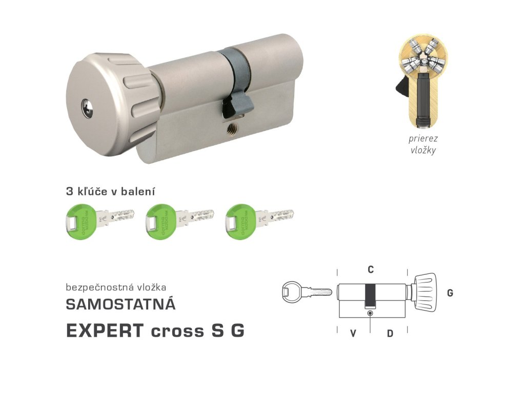 EXPERT cross S G je samostatná bezpečnostná vložka s možnosťou zjednotenia viacerých vložiek na spoločný kľúč.