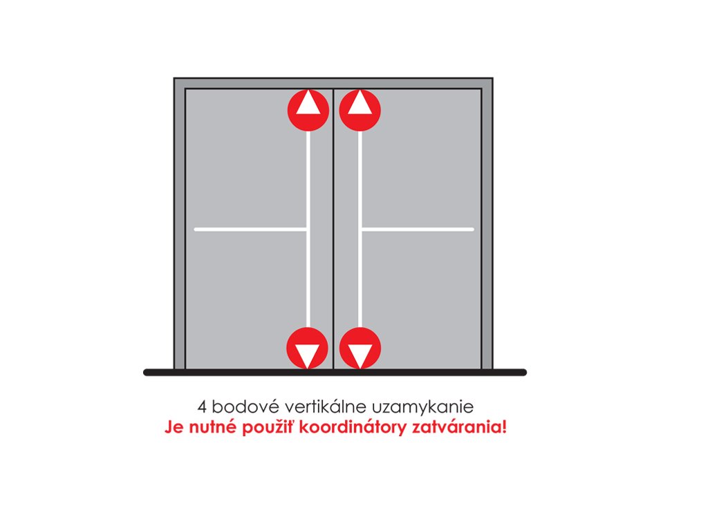 Dvojkrídlové dvere so štvorbodovým zaistením D2/ 2H-2D – 4-bodové vertikálne uzamykanie, je nutné použiť koordinátory zatvárania a samozatvárač, sú určené pre protipožiarne a dymotesné dvere.