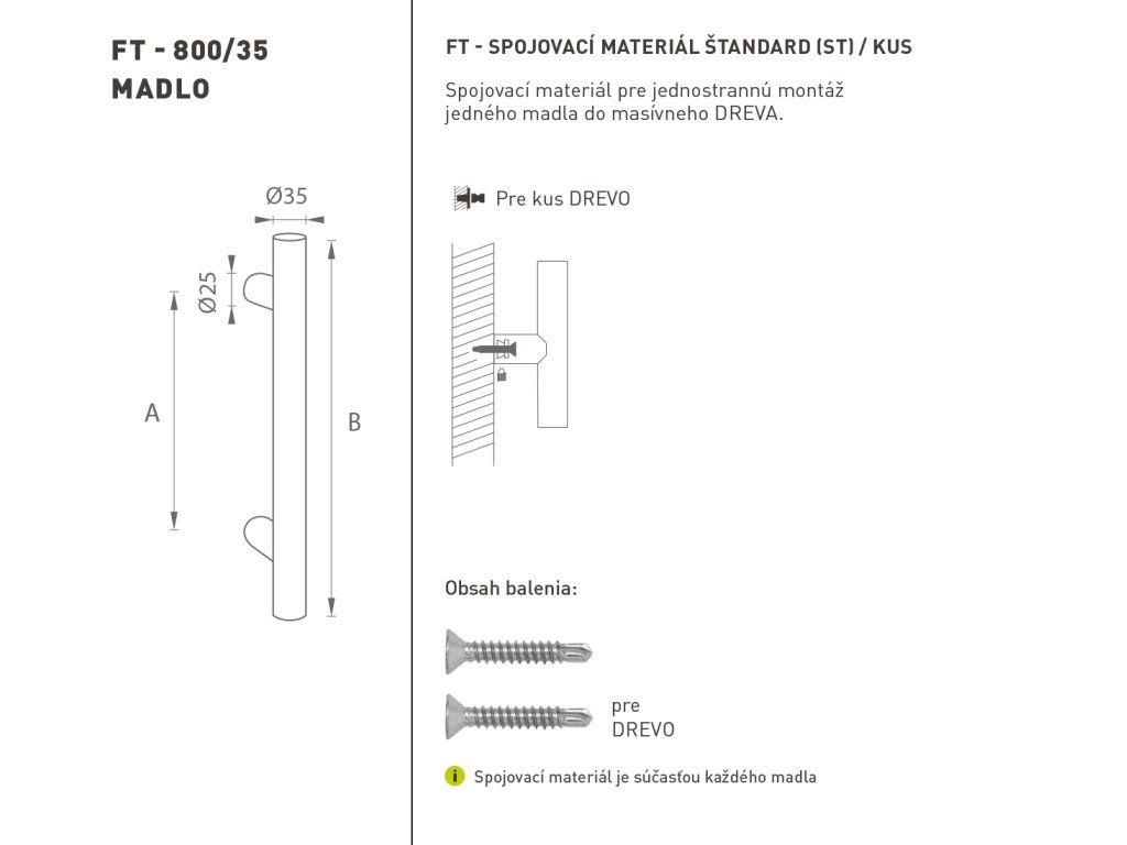 Madlo na dvere je vyrobené z vysokokvalitnej nehrdzavejúcej ocele, známej ako nerez a je povrchovo upravené. Profil madla je 35 mm. Súčasťou madla sú vruty 6 x 45 mmDodatočné parametre