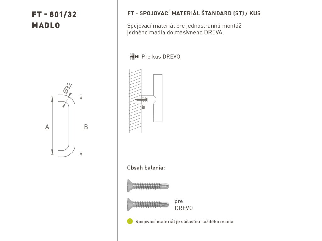 Madlo na dvere je vyrobené z vysokokvalitnej nehrdzavejúcej ocele, známej ako nerez a je povrchovo upravené. Profil madla je 32 mm. Súčasťou madla sú vruty 6 x 45 mm