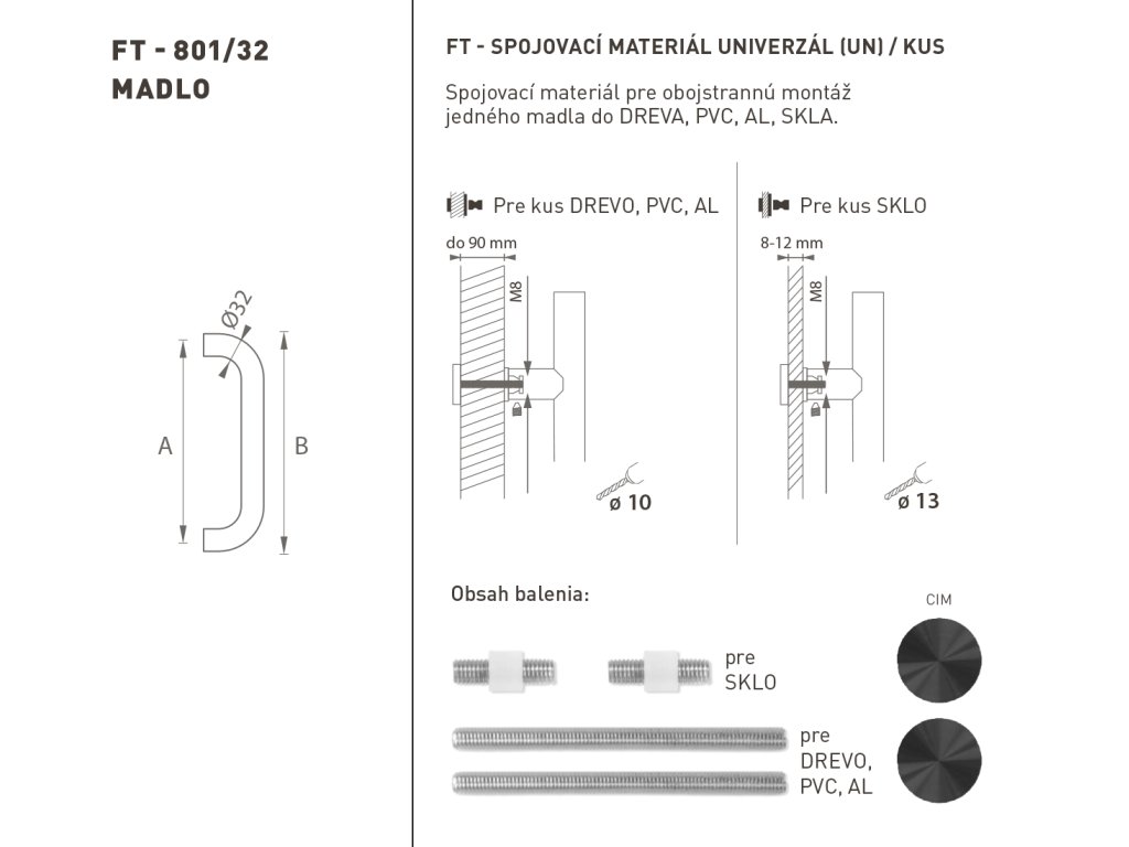 Madlo na dvere je vyrobené z vysokokvalitnej nehrdzavejúcej ocele, známej ako nerez a je povrchovo upravené. Profil madla je 32 mm. Sada UNIVERZÁL (UN) obsahuje spojovací materiál pre obojstrannú montáž jedného madla do dreva, PVC, AL, sklo.