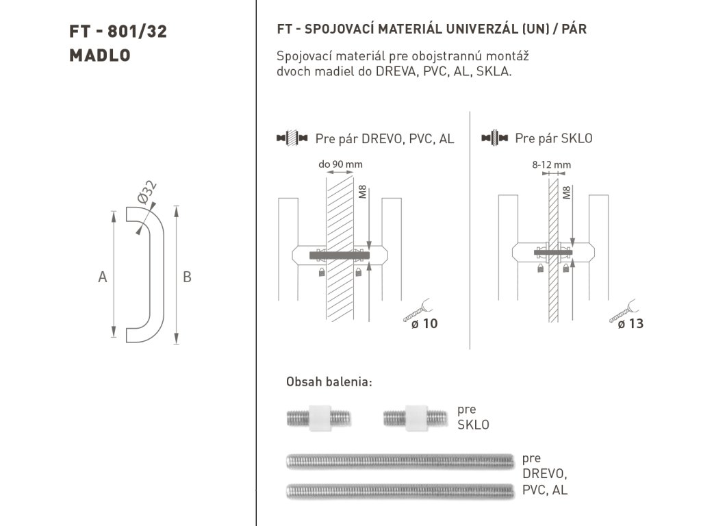 Madlo na dvere je vyrobené z vysokokvalitnej nehrdzavejúcej ocele, známej ako nerez a je povrchovo upravené. Profil madla je 32 mm. Sada UNIVERZÁL (UN) obsahuje spojovací materiál pre obojstrannú montáž dvoch madiel do dreva, PVC, AL, sklo.