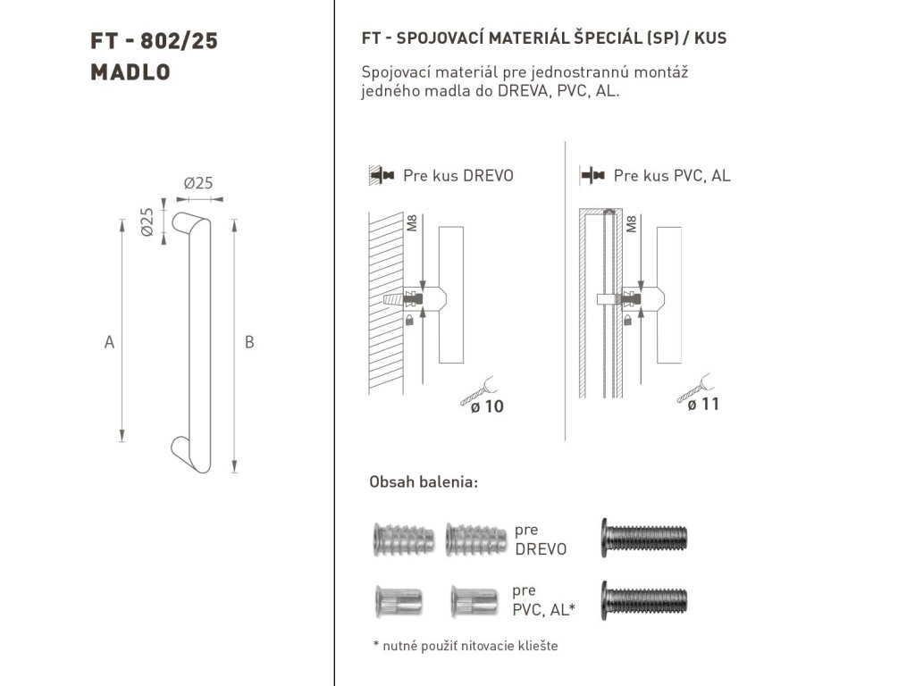 Madlo na dvere je vyrobené z vysokokvalitnej nehrdzavejúcej ocele, známej ako nerez a je povrchovo upravené. Profil madla je 25 mm. Sada ŠPECIÁL (SP) obsahuje spojovací materiál pre jednostrannú montáž jedného madla do dreva, PVC, AL.Dodatočné parametre