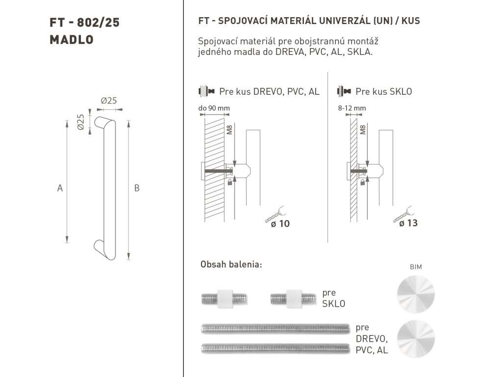 Madlo na dvere je vyrobené z vysokokvalitnej nehrdzavejúcej ocele, známej ako nerez a je povrchovo upravené. Profil madla je 25 mm. Sada UNIVERZÁL (UN) obsahuje spojovací materiál pre obojstrannú montáž jedného madla do dreva, PVC, AL, sklo.Dodatočné parametre