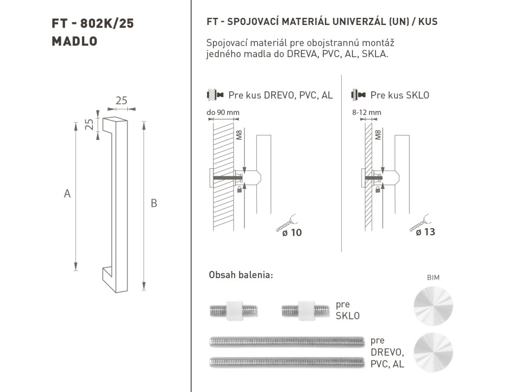 Madlo na dvere je vyrobené z vysokokvalitnej nehrdzavejúcej ocele, známej ako nerez a je povrchovo upravené. Profil madla je 25 x 25 mm. Sada UNIVERZÁL (UN) obsahuje spojovací materiál pre obojstrannú montáž jedného madla do dreva, PVC, AL, sklo.