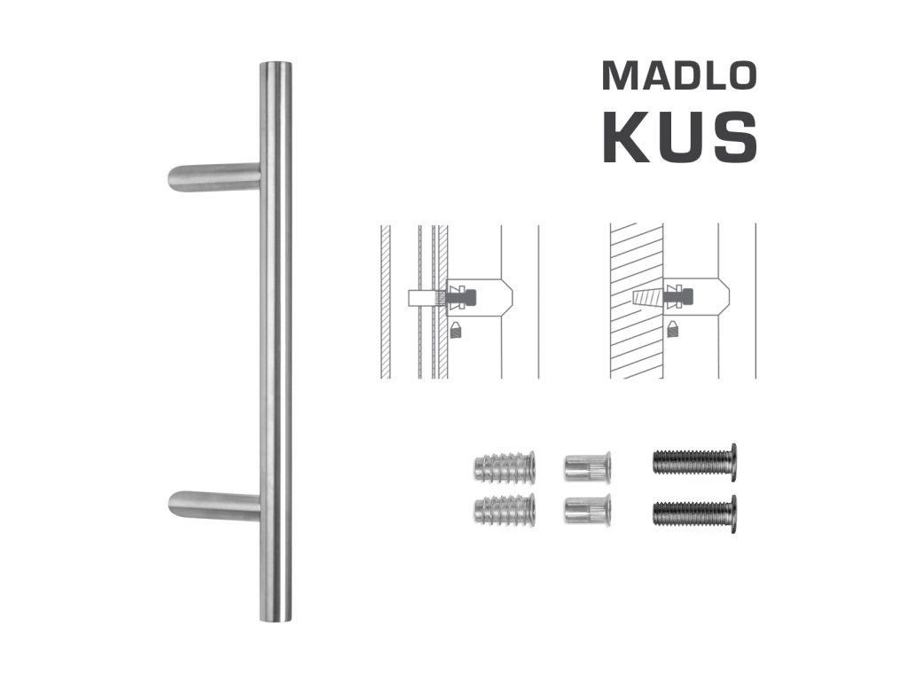 Madlo na dvere je vyrobené z vysokokvalitnej nehrdzavejúcej ocele, známej ako nerez a je povrchovo upravené. Profil madla je 30 mm. Sada ŠPECIÁL (SP) obsahuje spojovací materiál pre jednostrannú montáž jedného madla do dreva, PVC, AL. Madlo s dĺžkou 1600, 1800 a 2000 mm má 3 úchyty.