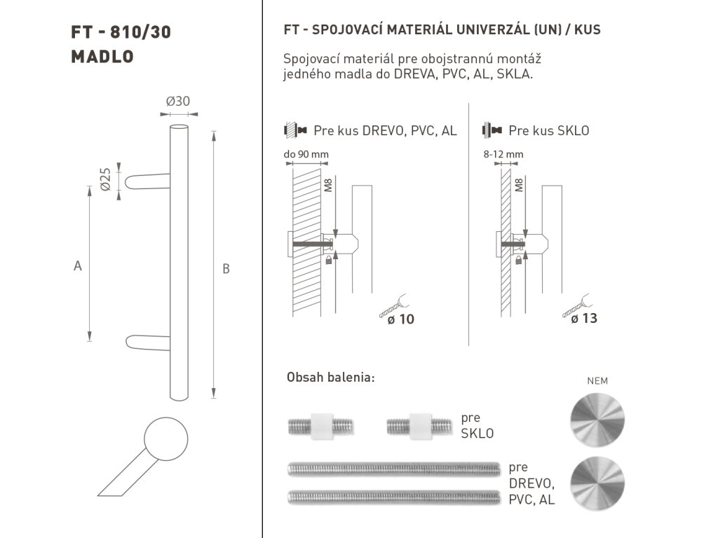 Madlo na dvere je vyrobené z vysokokvalitnej nehrdzavejúcej ocele, známej ako nerez a je povrchovo upravené. Profil madla je 30 mm. Sada UNIVERZÁL (UN) obsahuje spojovací materiál pre obojstrannú montáž jedného madla do dreva, PVC, AL, sklo. Madlo s dĺžkou 1600, 1800 a 2000 mm má 3 úchyty.