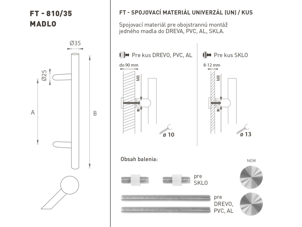 Madlo na dvere je vyrobené z vysokokvalitnej nehrdzavejúcej ocele, známej ako nerez a je povrchovo upravené. Profil madla je 35 mm. Sada UNIVERZÁL (UN) obsahuje spojovací materiál pre obojstrannú montáž jedného madla do dreva, PVC, AL, sklo.Dodatočné parametre