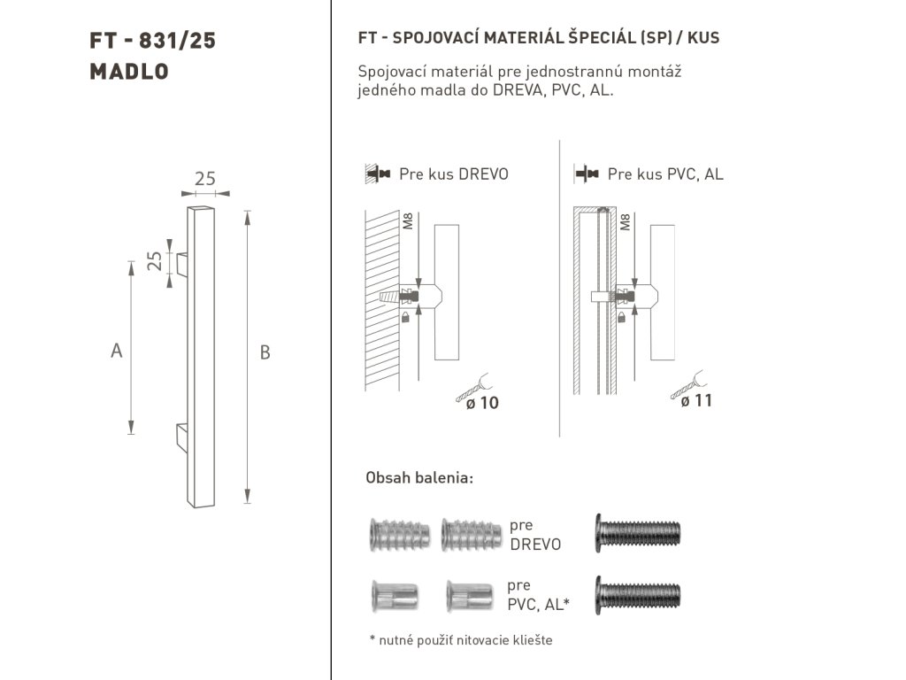 Madlo na dvere je vyrobené z vysokokvalitnej nehrdzavejúcej ocele, známej ako nerez a je povrchovo upravené. Profil madla je 25 x 25 mm. Sada ŠPECIÁL (SP) obsahuje spojovací materiál pre jednostrannú montáž jedného madla do dreva, PVC, AL.