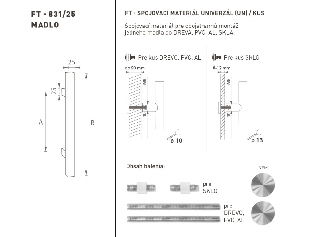 Madlo na dvere je vyrobené z vysokokvalitnej nehrdzavejúcej ocele, známej ako nerez a je povrchovo upravené. Profil madla je 25 x 25 mm. Sada UNIVERZÁL (UN) obsahuje spojovací materiál pre obojstrannú montáž jedného madla do dreva, PVC, AL, sklo.
