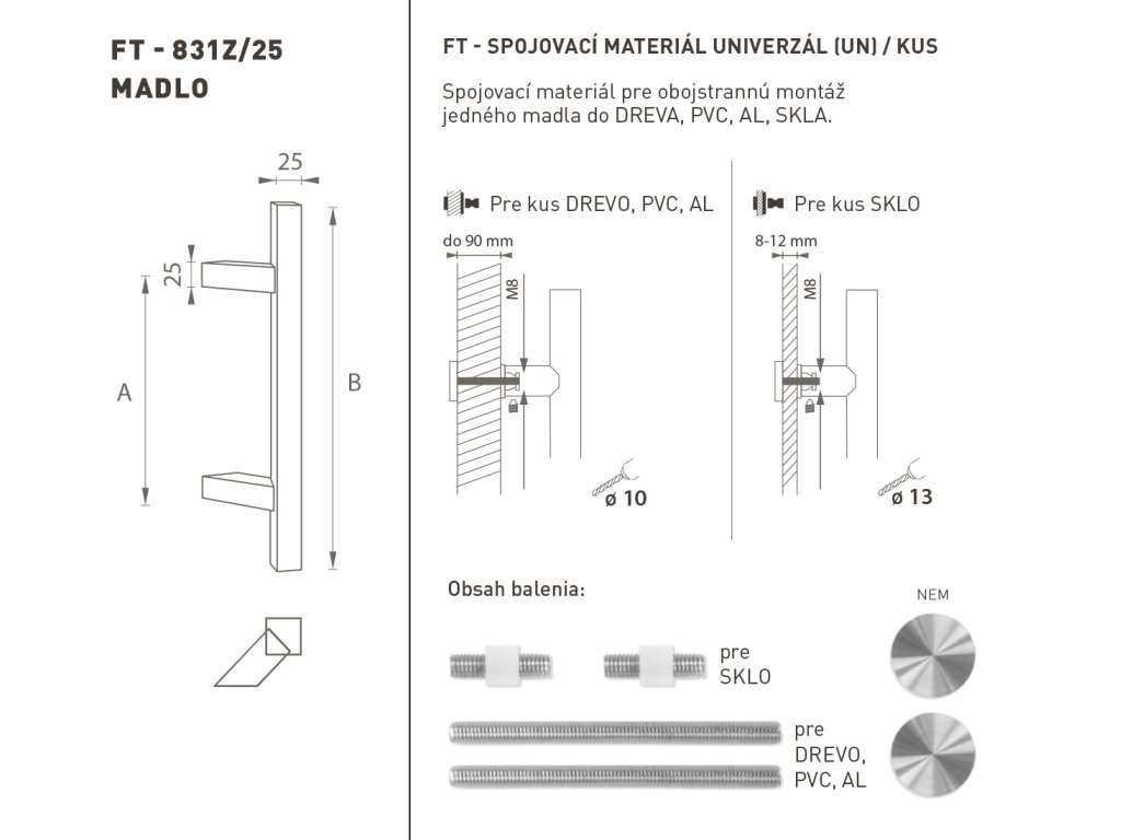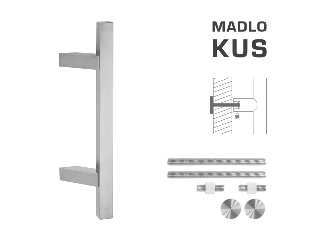Madlo na dvere je vyrobené z vysokokvalitnej nehrdzavejúcej ocele, známej ako nerez a je povrchovo upravené. Profil madla je 25 x 25 mm. Sada UNIVERZÁL (UN) obsahuje spojovací materiál pre obojstrannú montáž jedného madla do dreva, PVC, AL, sklo.