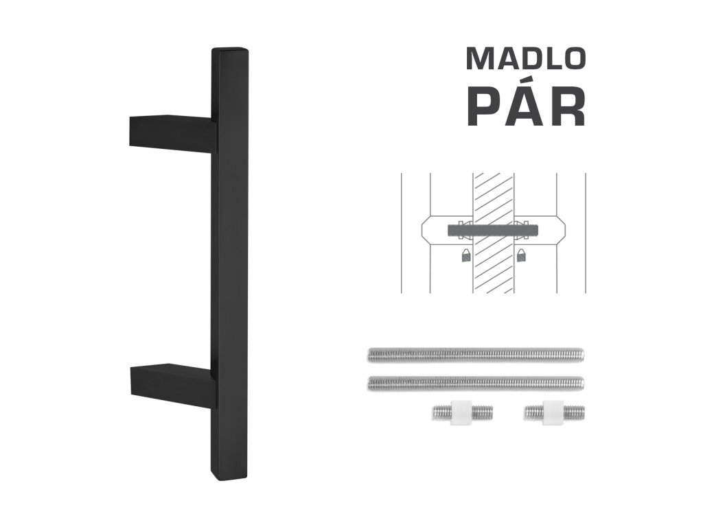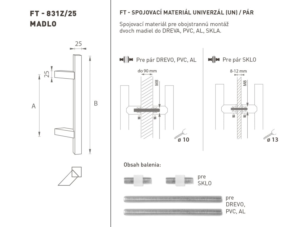 Madlo na dvere je vyrobené z vysokokvalitnej nehrdzavejúcej ocele, známej ako nerez a je povrchovo upravené. Profil madla je 25 x 25 mm. Sada UNIVERZÁL (UN) obsahuje spojovací materiál pre obojstrannú montáž dvoch madiel do dreva, PVC, AL, sklo.