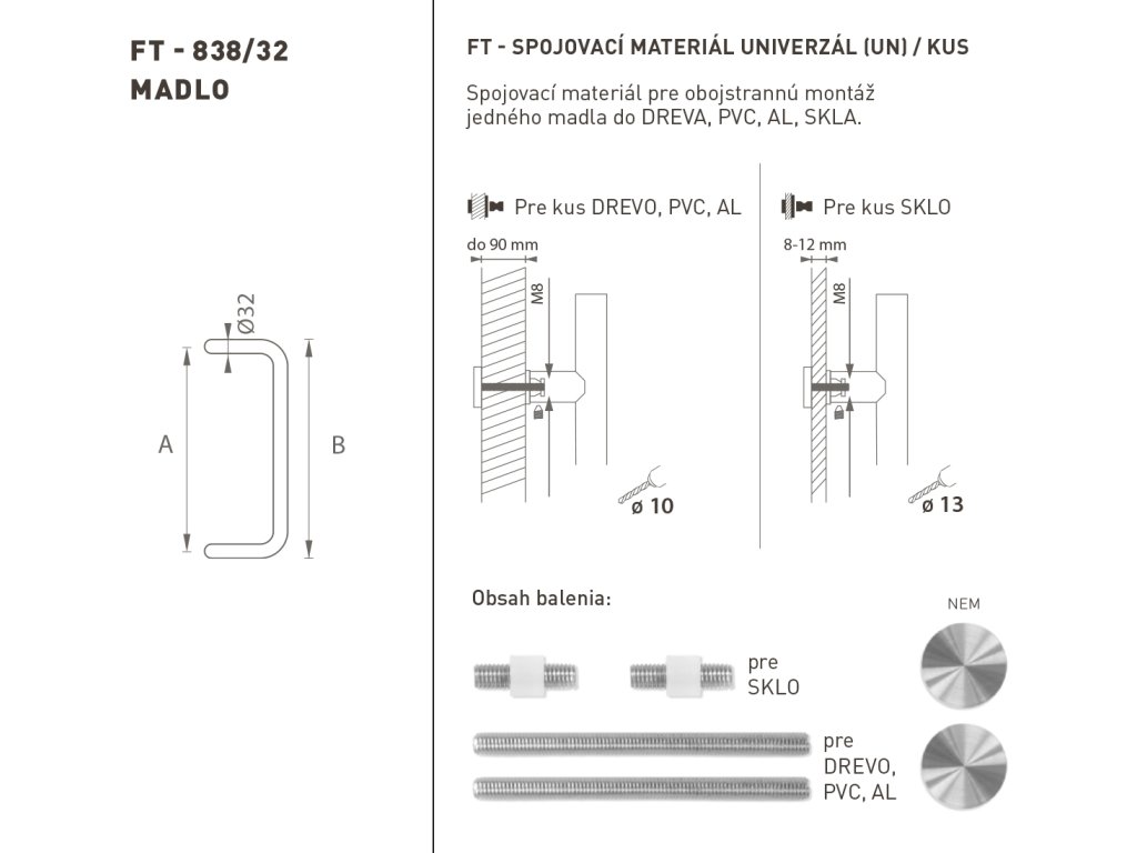 Madlo na dvere je vyrobené z vysokokvalitnej nehrdzavejúcej ocele, známej ako nerez a je povrchovo upravené. Profil madla je Ø 32 mm. Sada UNIVERZÁL (UN) obsahuje spojovací materiál pre obojstrannú montáž jedného madla do dreva, PVC, AL, sklo.