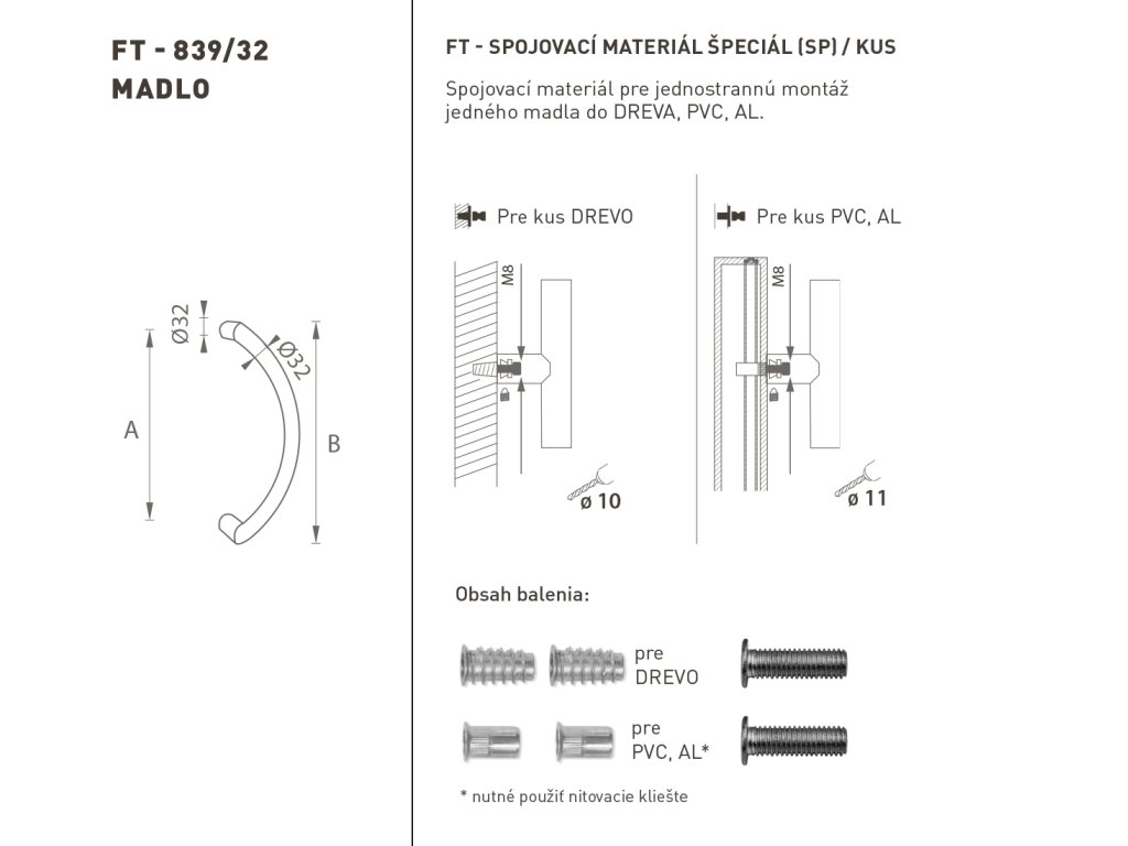 Madlo na dvere je vyrobené z vysokokvalitnej nehrdzavejúcej ocele, známej ako nerez a je povrchovo upravené. Profil madla je 32 mm. Sada ŠPECIÁL (SP) obsahuje spojovací materiál pre jednostrannú montáž jedného madla do dreva, PVC, AL.