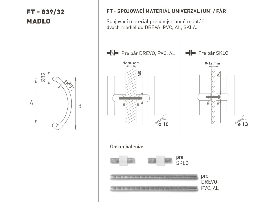 Madlo na dvere je vyrobené z vysokokvalitnej nehrdzavejúcej ocele, známej ako nerez a je povrchovo upravené. Profil madla je Ø 32 mm. Sada UNIVERZÁL (UN) obsahuje spojovací materiál pre obojstrannú montáž dvoch madiel do dreva, PVC, AL, sklo.