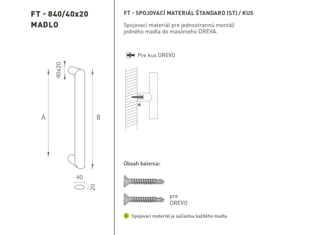 Madlo na dvere je vyrobené z vysokokvalitnej nehrdzavejúcej ocele, známej ako nerez a je povrchovo upravené. Profil madla je 40 x 20 mm. Súčasťou madla sú vruty 6 x 45 mmDodatočné parametre