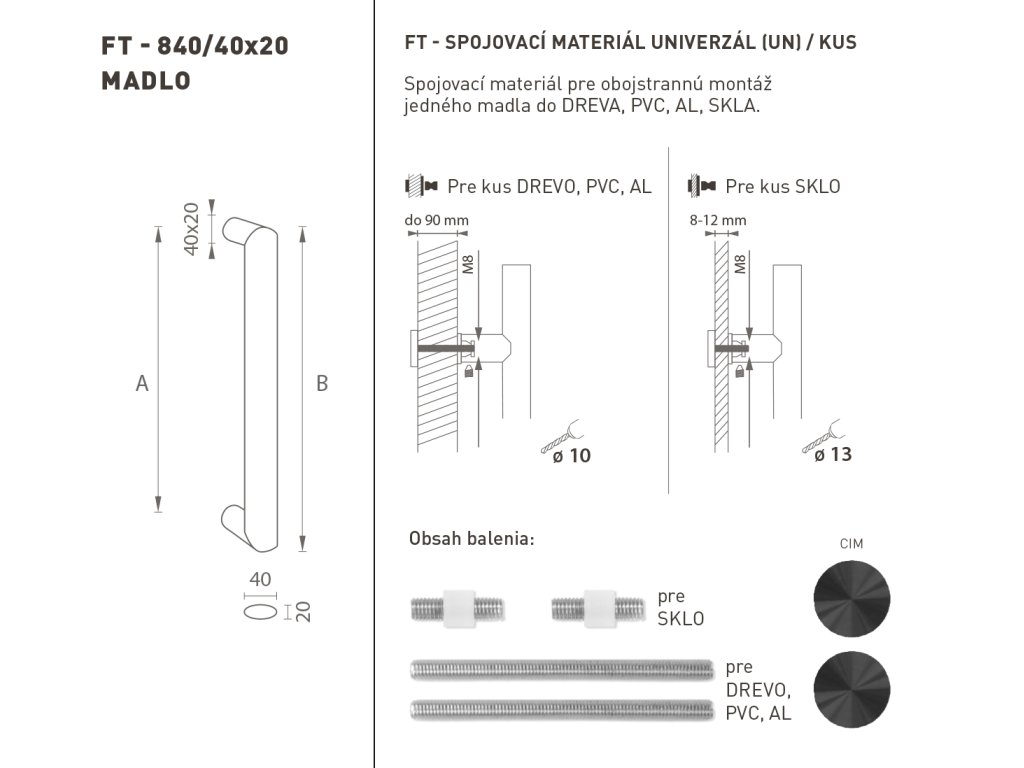 Madlo na dvere je vyrobené z vysokokvalitnej nehrdzavejúcej ocele, známej ako nerez a je povrchovo upravené. Profil madla je 40 x 20 mm. Sada UNIVERZÁL (UN) obsahuje spojovací materiál pre obojstrannú montáž jedného madla do dreva, PVC, AL, sklo.Dodatočné parametre