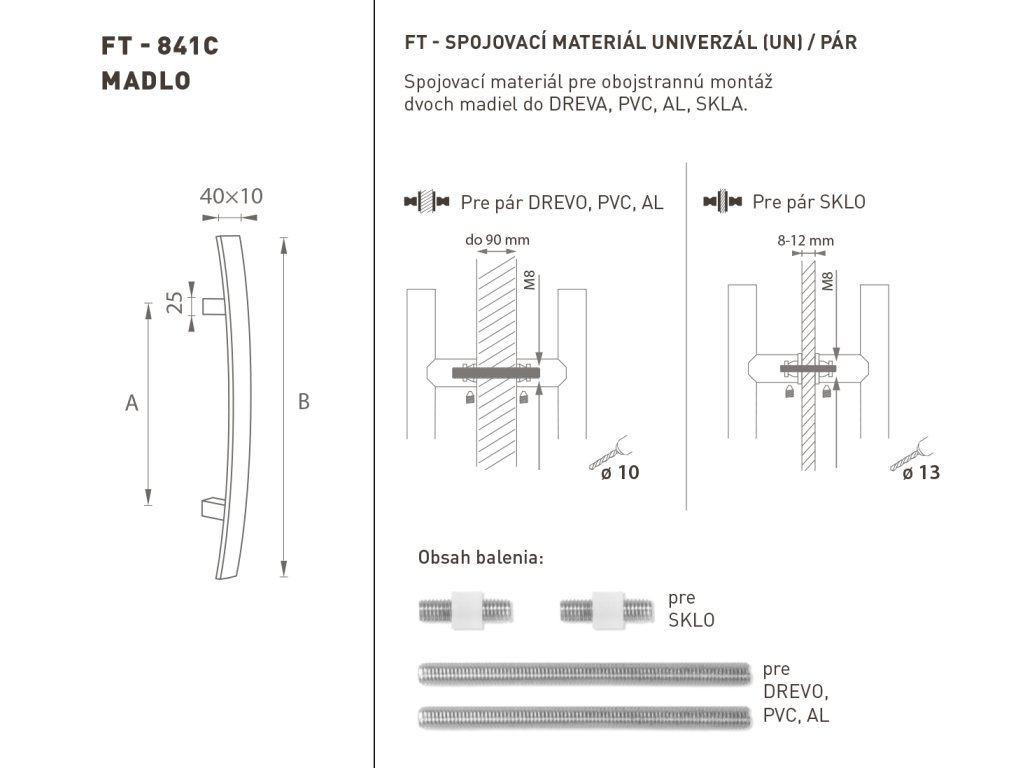 Madlo na dvere je vyrobené z vysokokvalitnej nehrdzavejúcej ocele, známej ako nerez a je povrchovo upravené. Profil madla je 40 x 10 mm. Sada UNIVERZÁL (UN) obsahuje spojovací materiál pre obojstrannú montáž dvoch madiel do dreva, PVC, AL, sklo.Dodatočné parametre