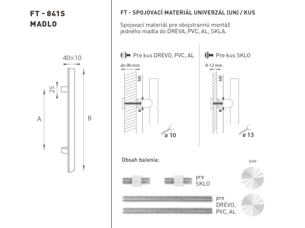 Madlo na dvere je vyrobené z vysokokvalitnej nehrdzavejúcej ocele, známej ako nerez a je povrchovo upravené. Profil madla je 40 x 10 mm. Sada UNIVERZÁL (UN) obsahuje spojovací materiál pre obojstrannú montáž jedného madla do dreva, PVC, AL, sklo.Dodatočné parametre