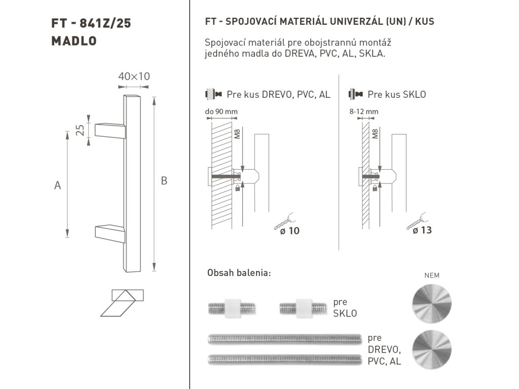 Madlo na dvere je vyrobené z vysokokvalitnej nehrdzavejúcej ocele, známej ako nerez a je povrchovo upravené. Profil madla je 40 x 10 mm. Sada UNIVERZÁL (UN) obsahuje spojovací materiál pre obojstrannú montáž jedného madla do dreva, PVC, AL, sklo. Madlo s dĺžkou 1800 mm má 3 úchyty.