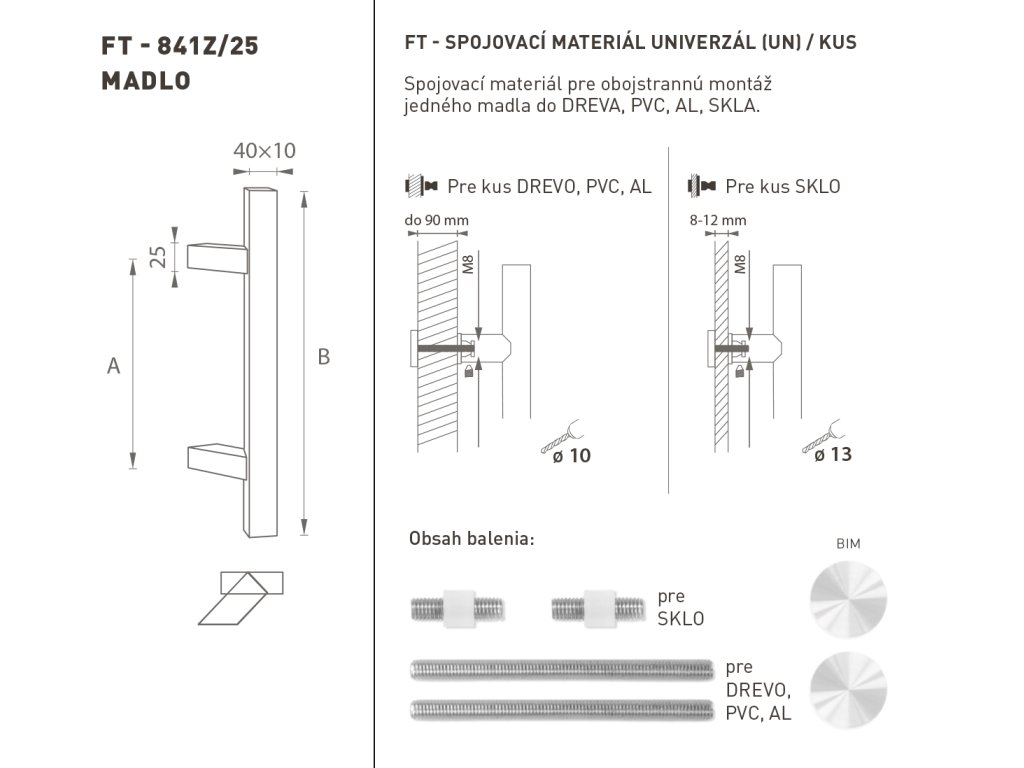 Madlo na dvere je vyrobené z vysokokvalitnej nehrdzavejúcej ocele, známej ako nerez a je povrchovo upravené. Profil madla je 40 x 10 mm. Sada UNIVERZÁL (UN) obsahuje spojovací materiál pre obojstrannú montáž jedného madla do dreva, PVC, AL, sklo.