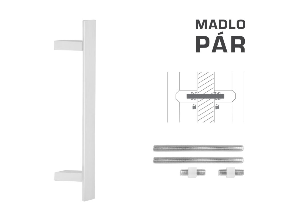 Madlo na dvere je vyrobené z vysokokvalitnej nehrdzavejúcej ocele, známej ako nerez a je povrchovo upravené. Profil madla je 40x10 mm. Sada UNIVERZÁL (UN) obsahuje spojovací materiál pre obojstrannú montáž dvoch madiel do dreva, PVC, AL, sklo.
