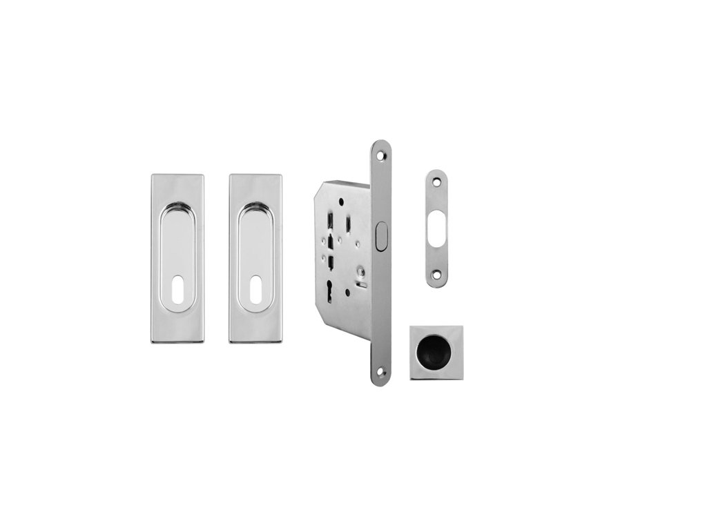 Hranatý set na posuvné dvere s otvorom pre interiérový kľúč (BB) s rozmermi čela zámku v dĺžke 160 mm, šírke 18 mm, hrúbke 2 mm. Rozteč (vzdialenosť medzi otvorom na kľučku a vložkou/kľúčom) - 70 mm , zádlab - 65 mm a dormas (vzdialenosť osi kľučky od lišty zámku) - 48 mm.