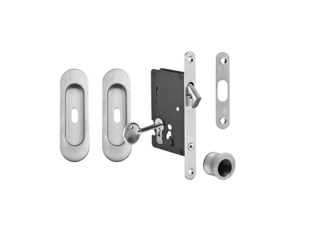 Oválny set na posuvné dvere s otvorom pre interiérový kľúč (BB). Set obsahuje: zámok JNF - IN.20.923, pár mušlí - FT - 3665AF, madielko ATZ - 3918