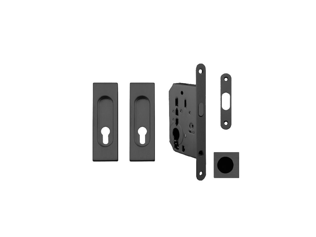 Hranatý set na posuvné dvere s otvorom pre cylindrickú vložku (PZ) s rozmermi čela zámku v dĺžke 160 mm, šírke 18 mm, hrúbke 2 mm. Rozteč (vzdialenosť medzi otvorom na kľučku a vložkou/kľúčom) - 70 mm , zádlab - 65 mm a dormas (vzdialenosť osi kľučky od lišty zámku) - 48 mm.