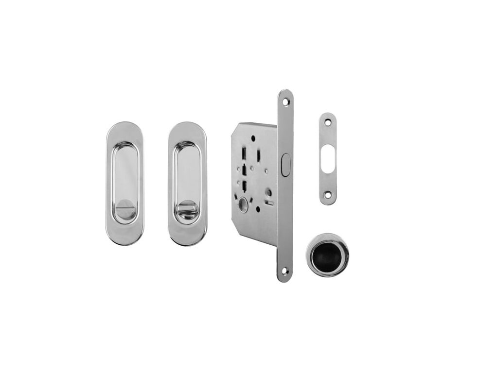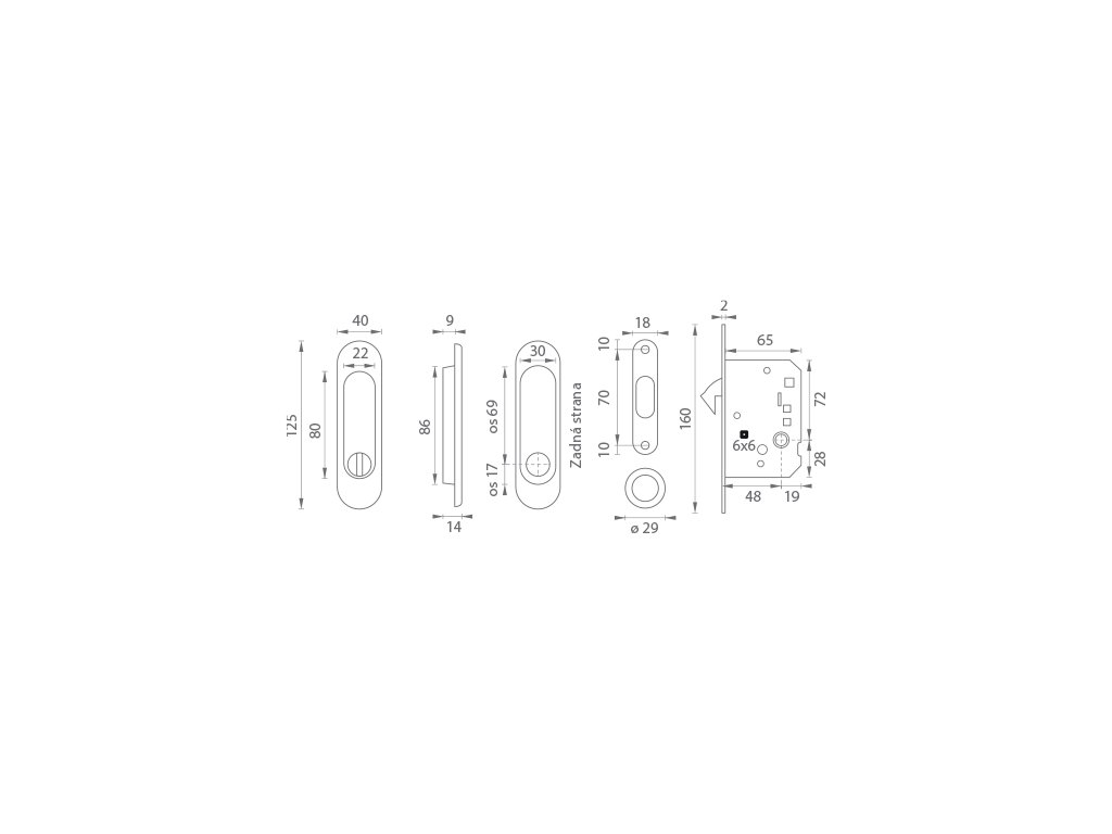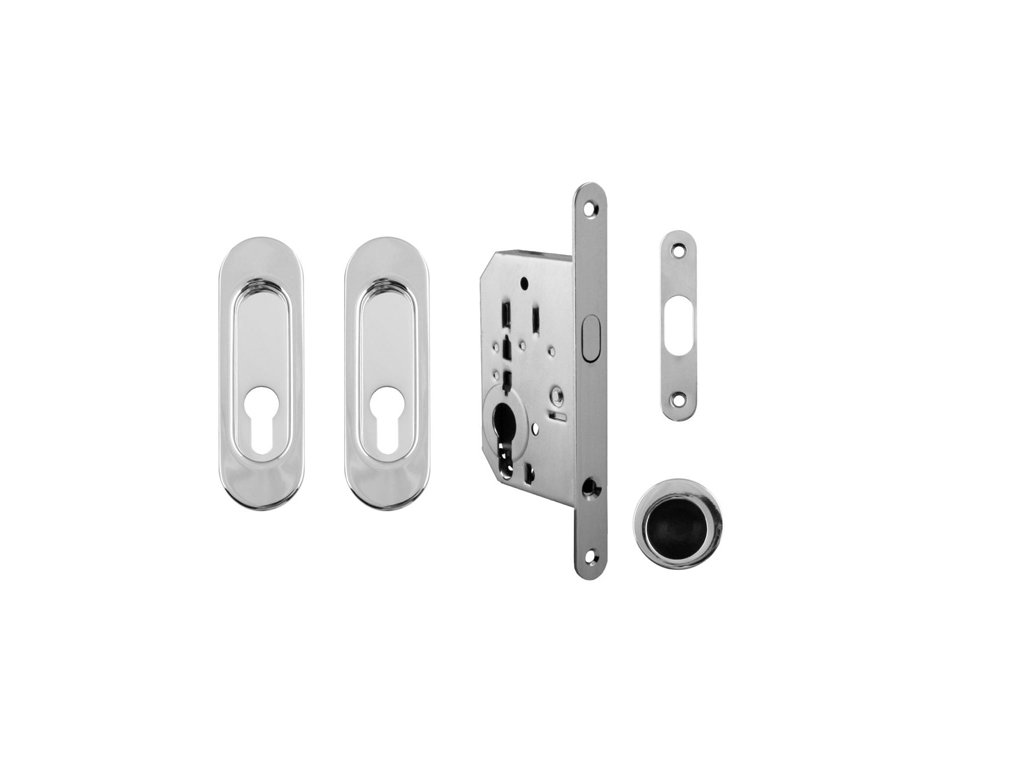 Okrúhly set na posuvné dvere s otvorom pre cylindrickú vložku (PZ) s rozmermi čela zámku v dĺžke 160 mm, šírke 18 mm, hrúbke 2 mm. Rozteč (vzdialenosť medzi otvorom na kľučku a vložkou/kľúčom) - 70 mm , zádlab - 65 mm a dormas (vzdialenosť osi kľučky od lišty zámku) - 48 mm.