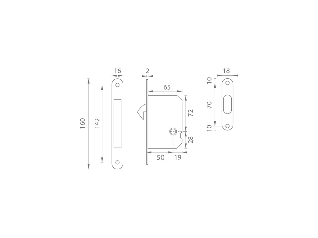 Zámok na posuvné dvere s otvorom pre WC kľúč s rozmermi čela zámku v dĺžke 160 mm, šírke 16 mm, hrúbke 2 mm. Rozteč (vzdialenosť medzi otvorom na kľučku a vložkou/kľúčom) - 70 mm , zádlab - 65 mm a dormas (vzdialenosť osi kľučky od lišty zámku) - 50 mm. Protiplech má rozmery 18 x 90 mm a je súčasťou balenia.